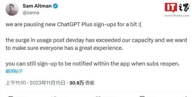 ,OpenAI 首席执行官 Sam Altman 在 X 平台发文称,将暂停 ChatGPT Plus 新用户注册。“开发日后使用量的激增超出了我们的承受能力,我们希望确保每个人都有良好的体验。”