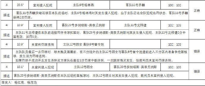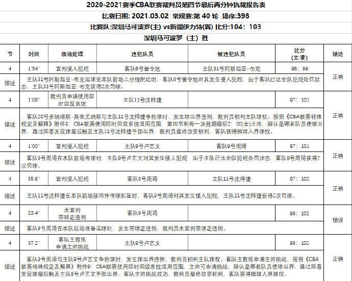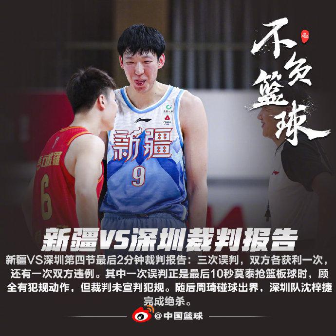 新疆VS深圳第四节最后2分钟裁判报告:三次误判,双方各获利一次。其中一次误判正是最后10秒莫泰抢篮板球时,顾全有犯规动作,但裁判未宣判犯规。随后周琦碰球出界,深圳队沈梓捷完成绝杀。