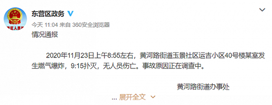 据山东省东营市@东营区政务 微博通报,11月23日上午8:55左右,黄河路街道玉景社区运吉小区40号楼某室发生燃气爆炸,9:15扑灭,无人员伤亡。事故原因正在调查中。