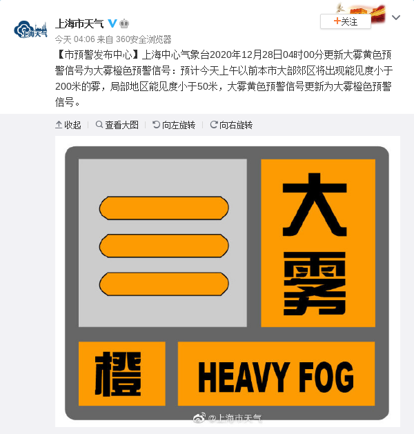 上海中心气象台2020年12月28日04时00分更新大雾黄色预警信号为大雾橙色预警信号:预计今天上午以前本市大部郊区将出现能见度小于200米的雾,局部地区能见度小于50米,大雾黄色预警信号更新为大雾橙色预警信号。