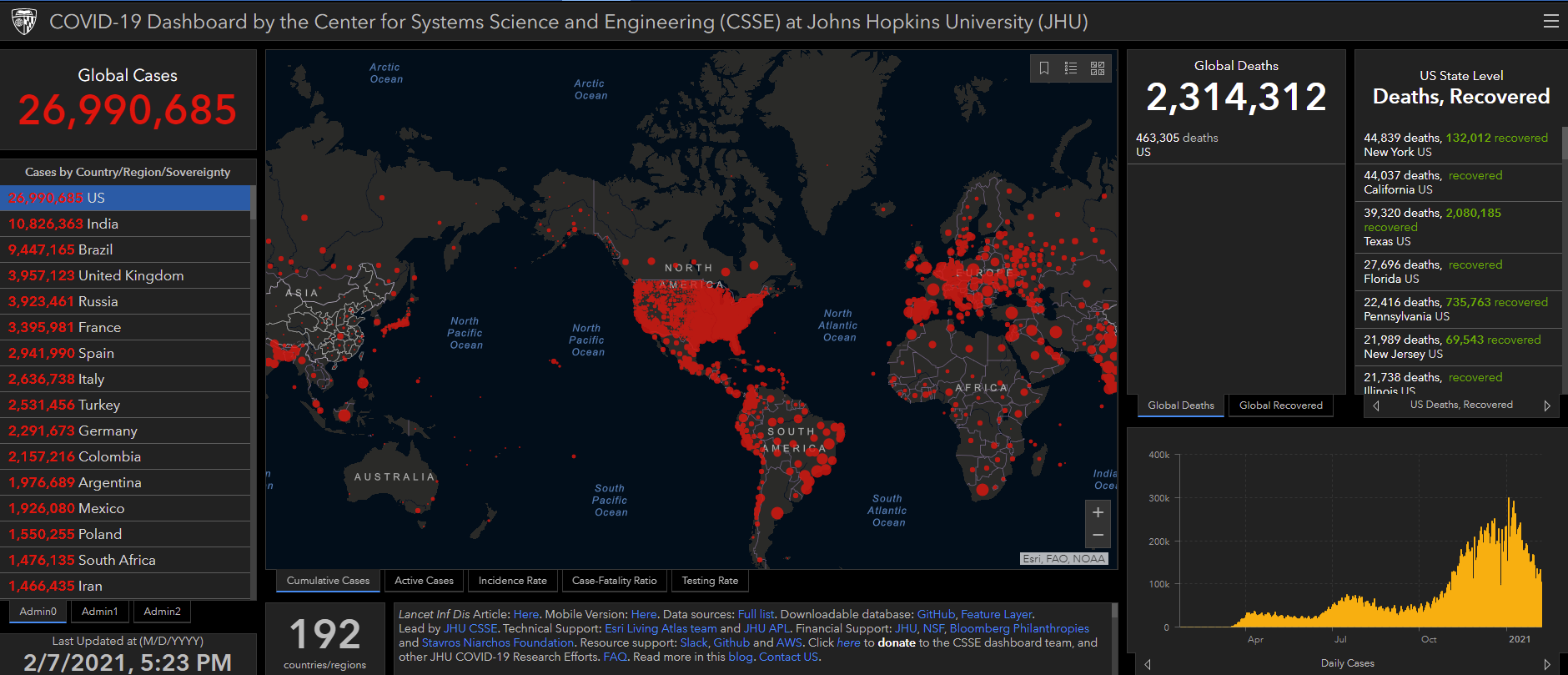 根据美国霍普金斯大学截至美东时间7日17点23分数据,美国新冠感染人数已达到26990685人,死亡人数达到463305人。