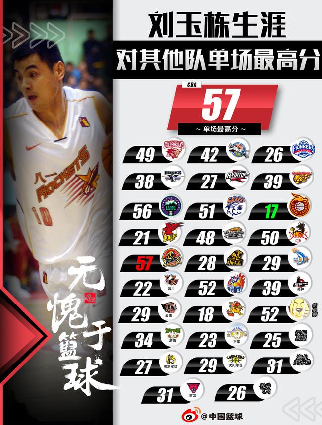 北京时间9月11日,战胜刘玉栋职业生涯对阵其他球队单场最高分一览!生涯最高57分,对阵那支球队只拿到17分!